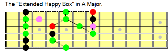 This position incorporates both the “Happy Box” and the “Stairstep Box”, in their Hexatonic forms. All of the notes of an A Major chord are highlighted in green. The good bending locations are highlighted in red, and the extra note that transforms the Major Pentatonic into the Major Hexatonic is highlighted in pink.
