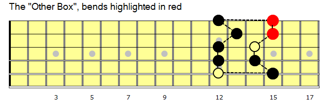 The “Other Box” can be thought of as sort of a little brother to “The Box”. While “The Box” has its root note on the 6th string, the “Other Box” has its root on the 5th string. Tons of cool licks can be generated from this position. It serves as a secondary home base when navigating away from “The Box” during your fretboard explorations.