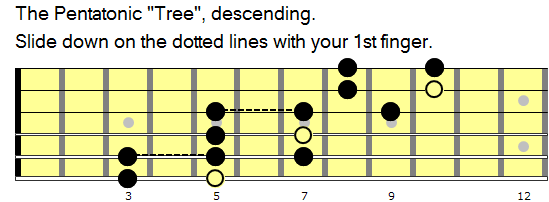 Now that we have our “Extended Box”, we can look at something referred to as the Pentatonic “Tree”. It’s called the “Tree” because it branches out on either side of “The Box”. The “Tree” is a simple pattern that uses all the whole step distances in our “Extended Box”. Using finger slides, it allows you to easily navigate from the 3rd fret to the 10th fret and back. It’s a very simple way to cover a lot of fretboard territory, and it’s the first step in learning to connect areas of the neck seamlessly.